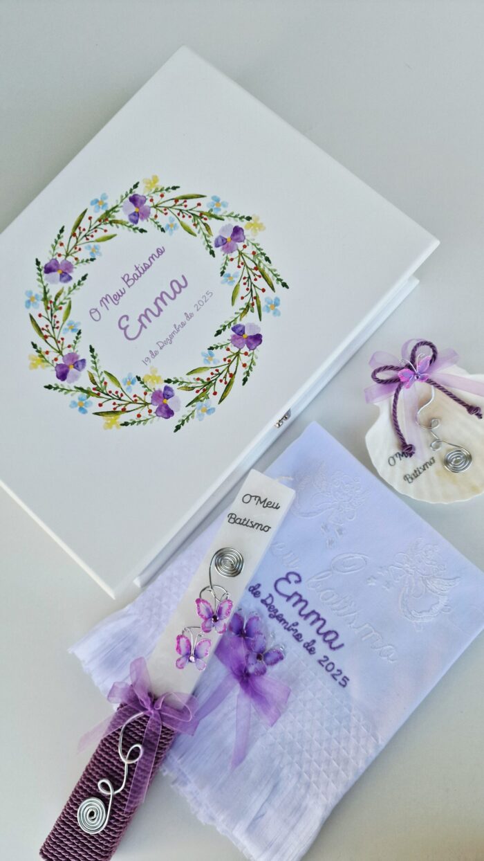 Conjunto Batizado Caixa Lilás, personalizado e impresso ao seu gosto: