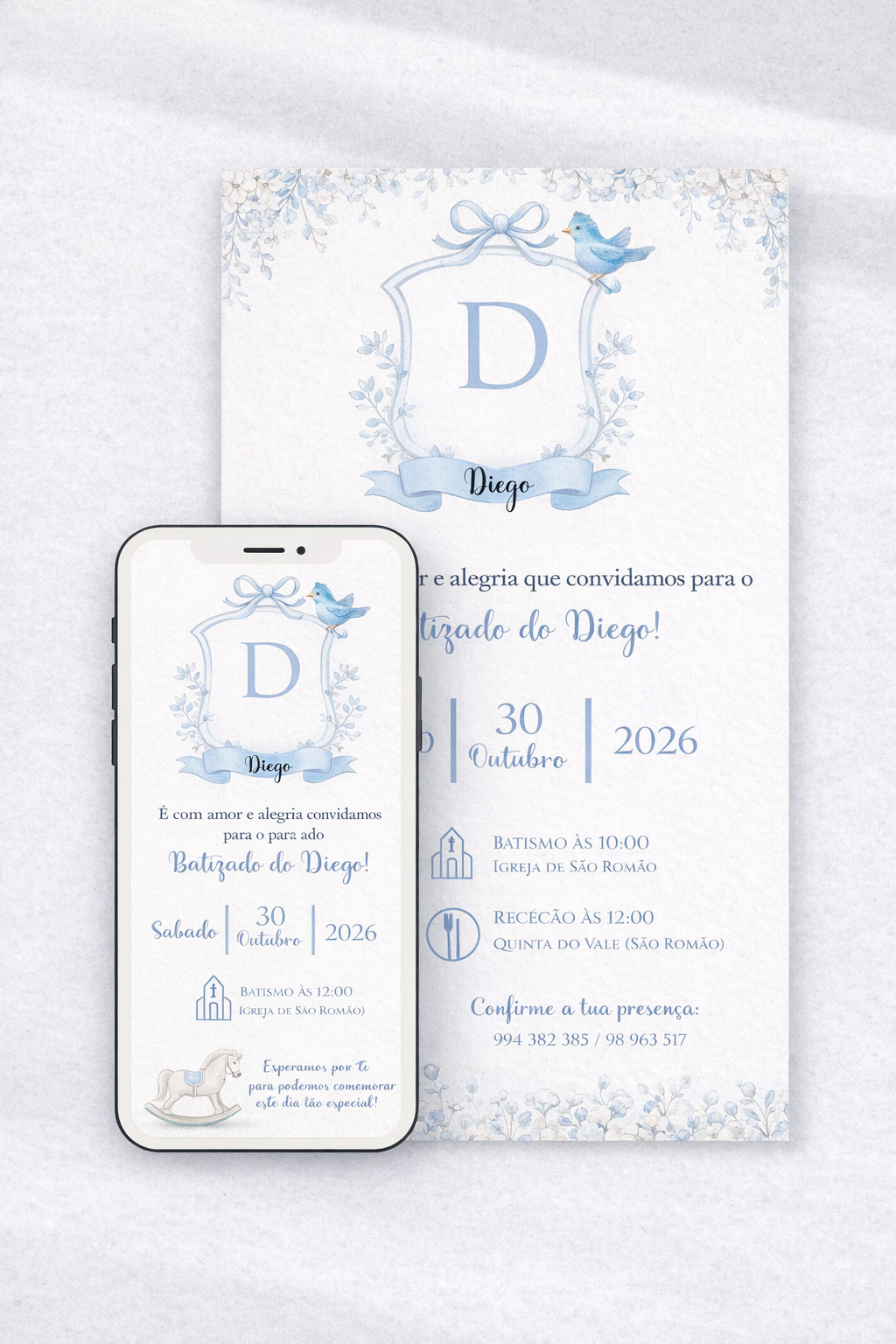 O Convite Batizado Digital Standard é a escolha ideal para quem procura um convite bonito, moderno e acessível para anunciar o batizado do seu bebé. Criado em formato digital, permite‑te enviar o convite de forma rápida e prática através de WhatsApp, email ou redes sociais, garantindo que todos os convidados recebem a informação sem atrasos.