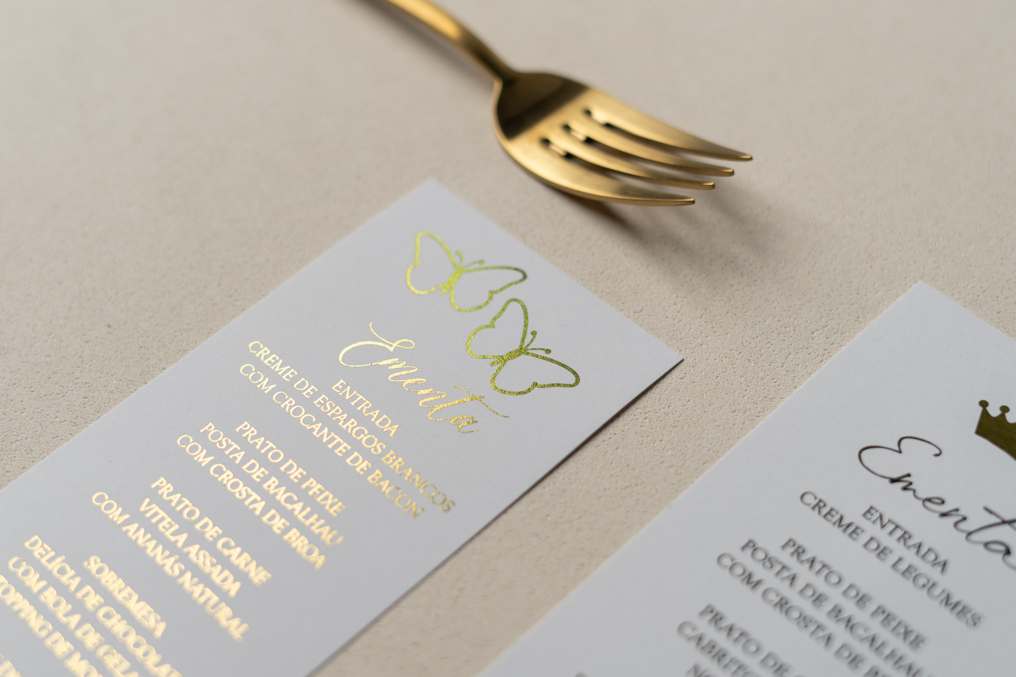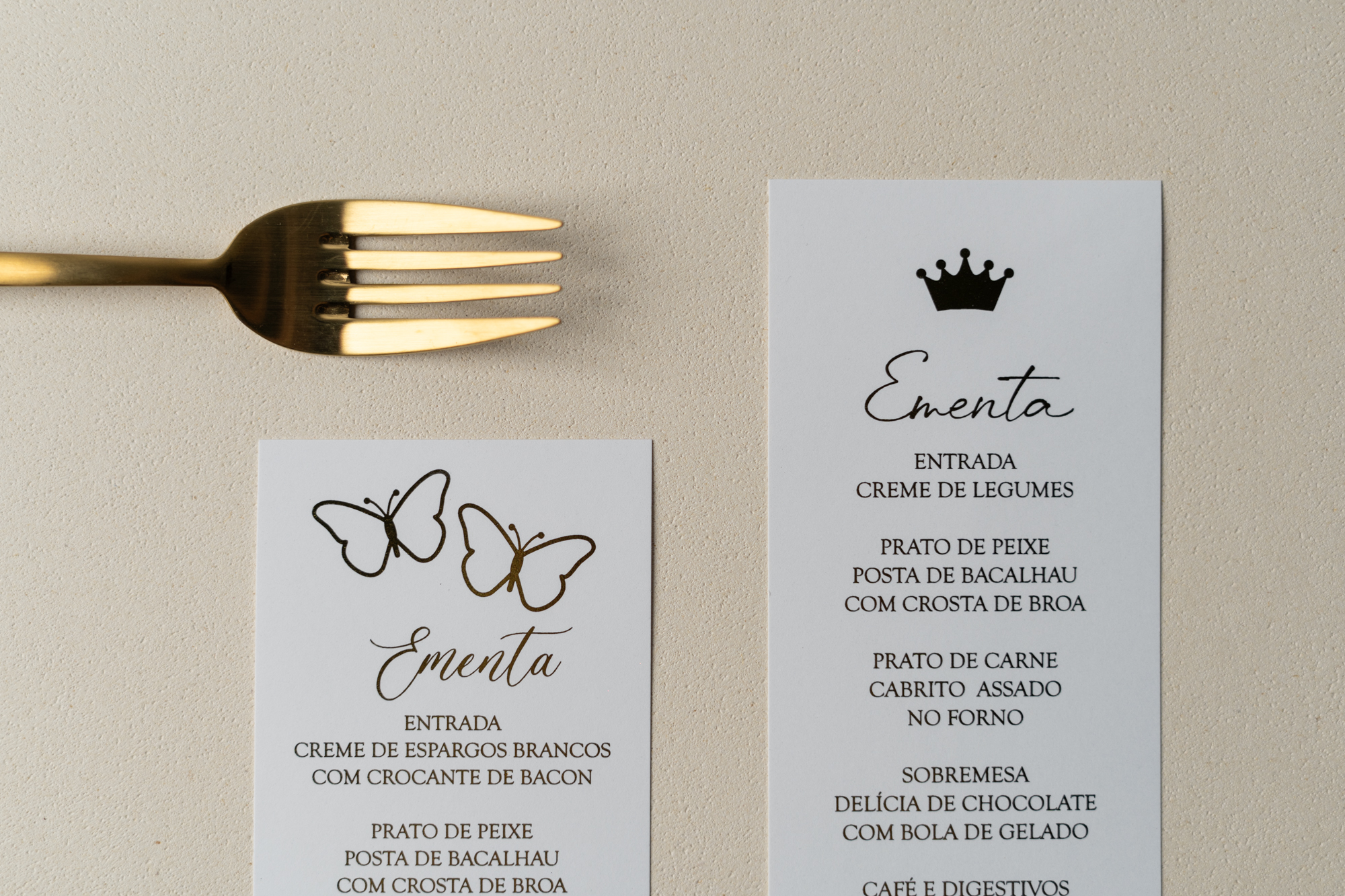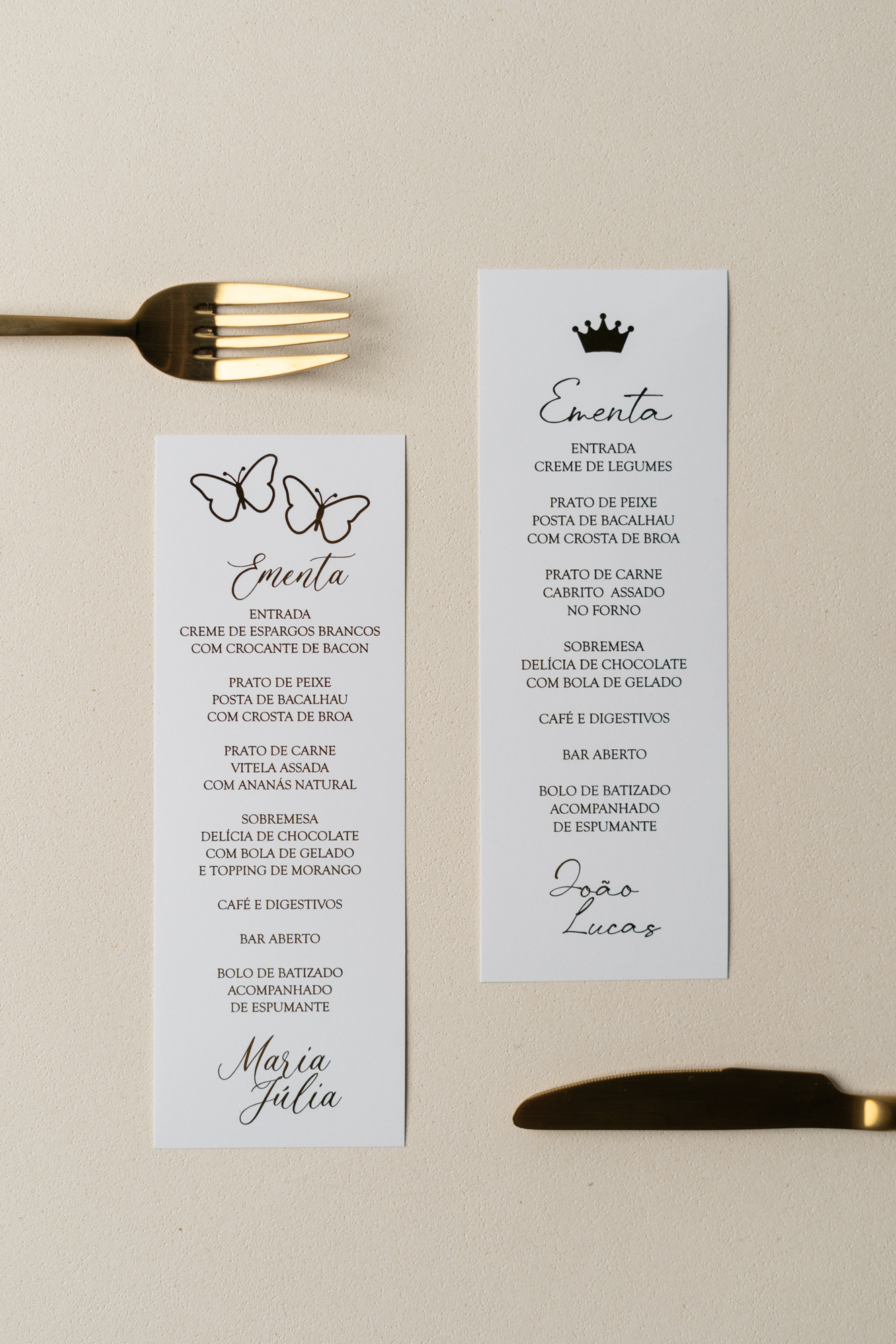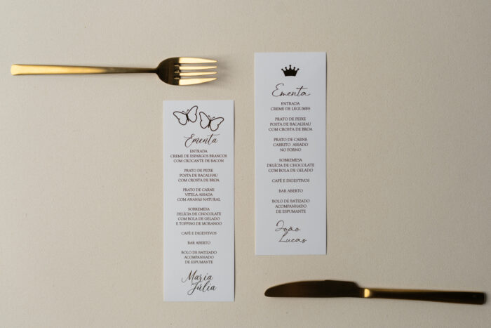 Temos ementas de todas as formas e cores e materiais e também a todos os preços. Além disso, a nossa Ementa Batizado Tema Príncipe é feita cá, já que é o que nos dá o controlo sobre o prazo de produção.