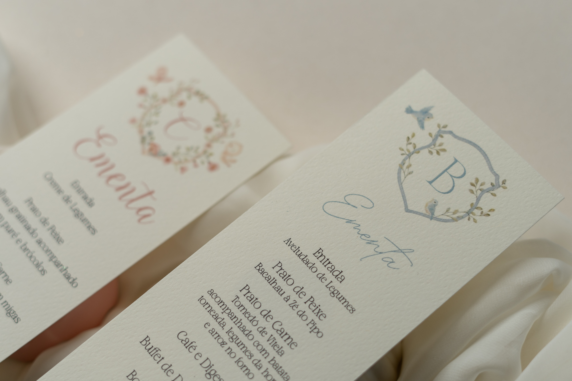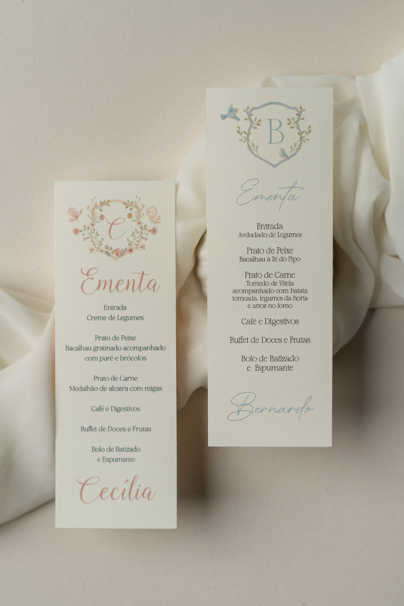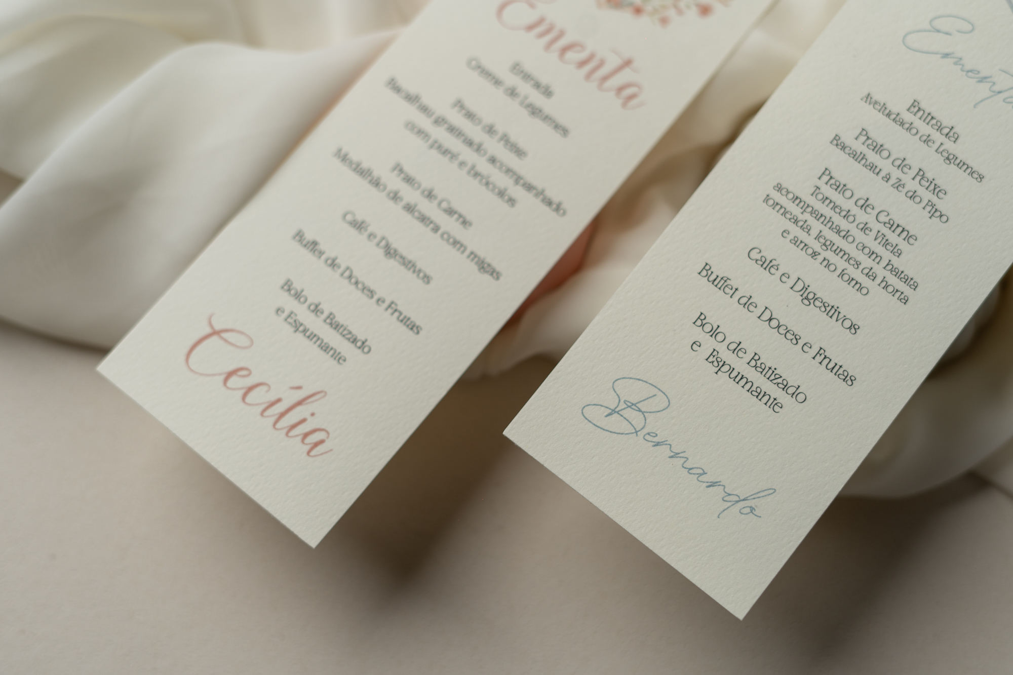 Temos ementas de todas as formas e cores e materiais e também a todos os preços. Além disso, o nosso Menu Batizado Elegante e Delicado é feito cá, já que é o que nos dá o controlo sobre o prazo de produção.