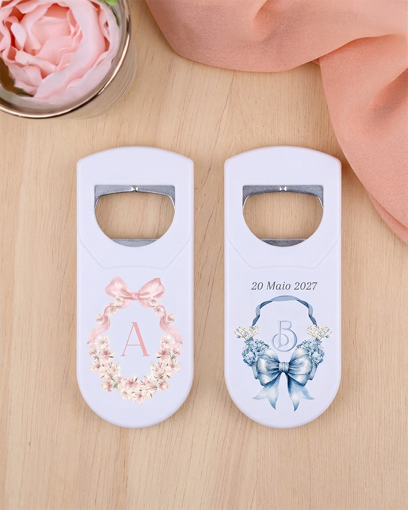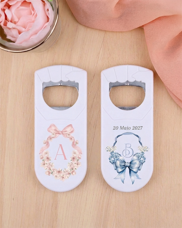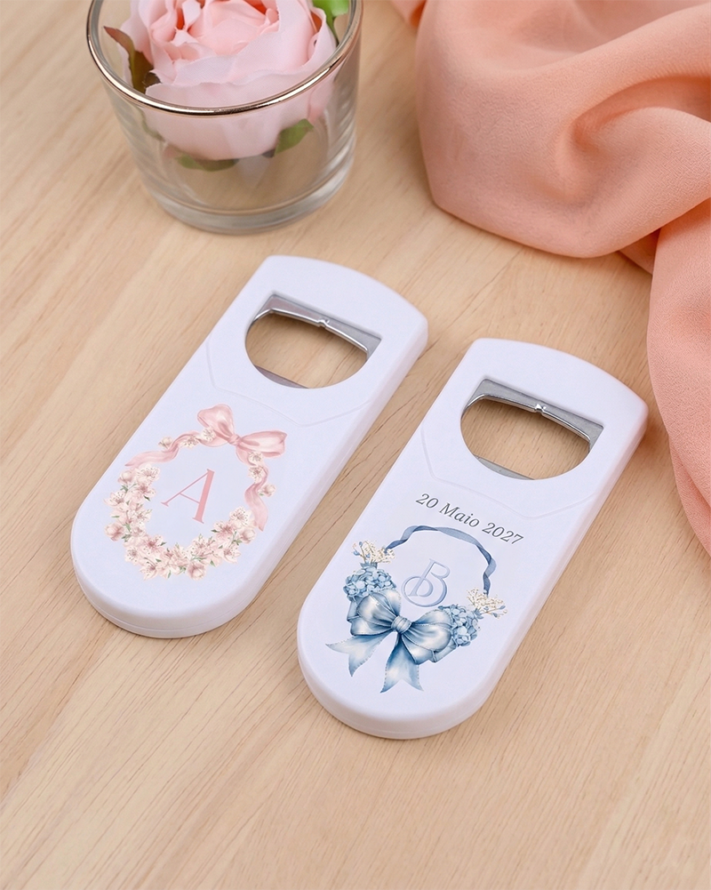 Temos brindes de todas as formas e cores e materiais e também a todos os preços. Além disso, o nosso Abre Cápsulas Batizado Lembrança é feito cá, já que é o que nos dá o controlo sobre o prazo de produção.