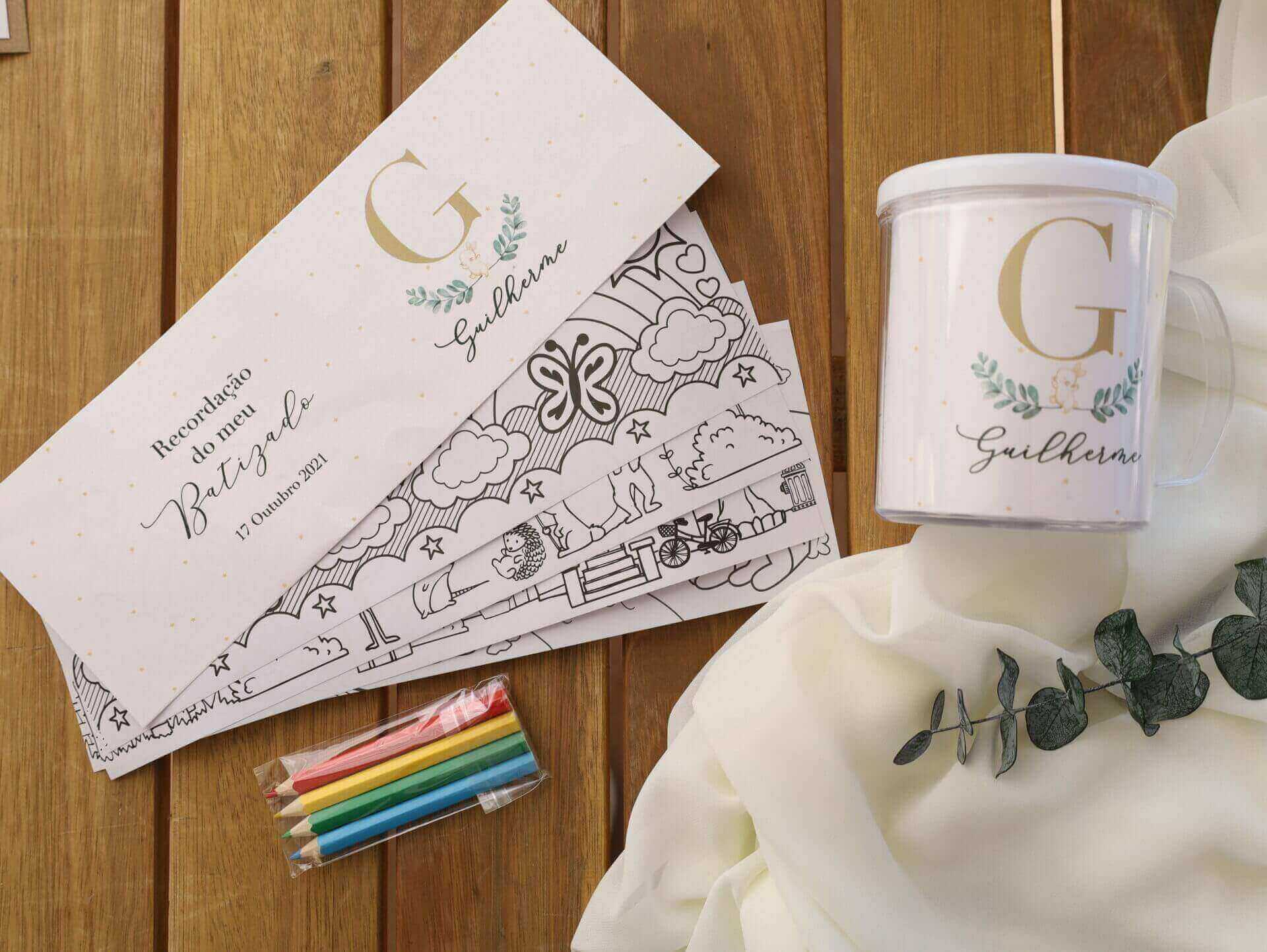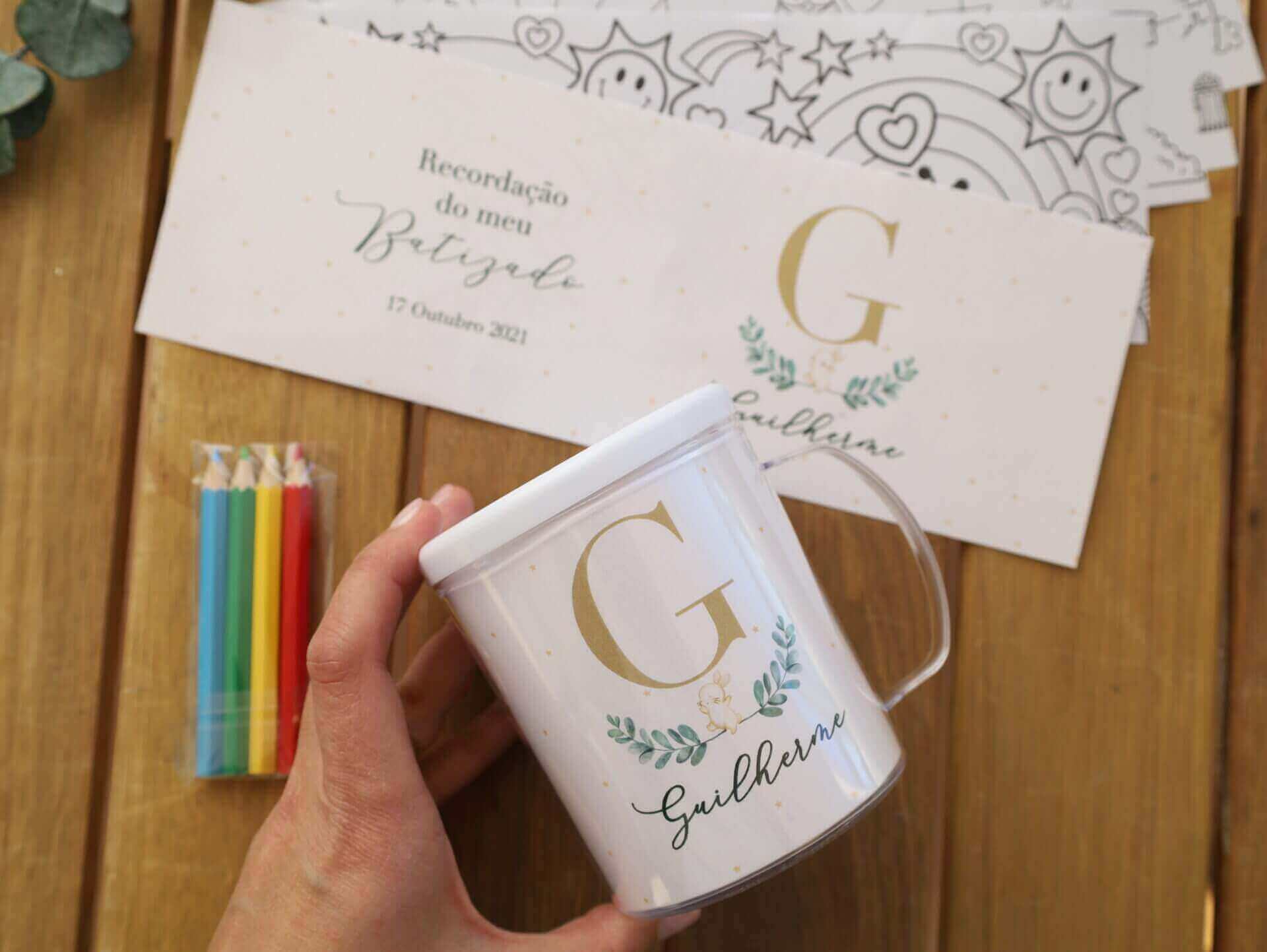 Inclui Caneca com 4 desenhos + cartão personalizado + 4 lápis de cor