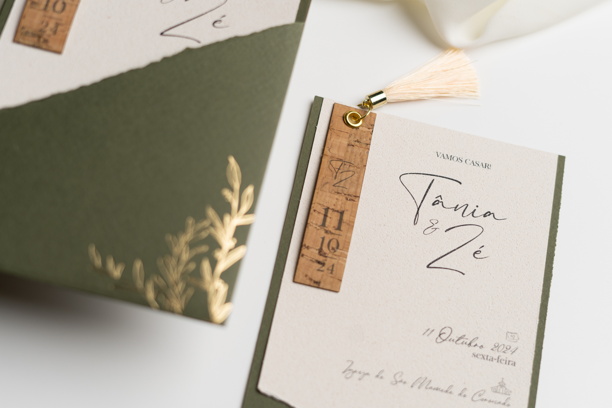Um convite rústico e cheio de elegância com impressão detalhe em dourado espelhado.