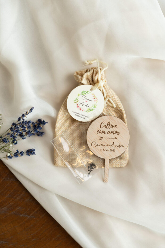 Lembrança Casamento Saco Sementes de amor perfeito e Identificador de Madeira