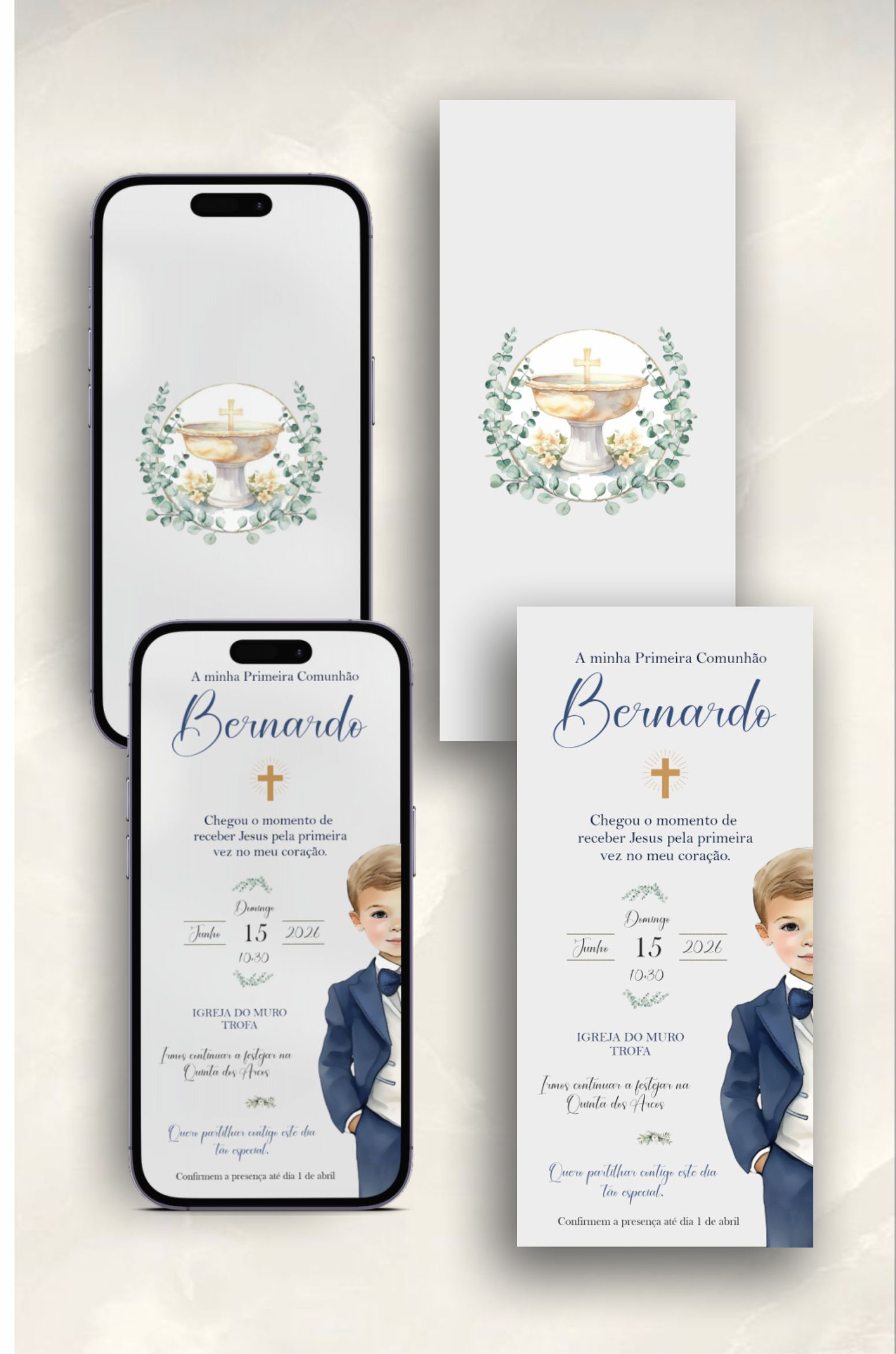 O Convite Comunhão Digital Standard é a opção ideal para quem procura um convite bonito, rápido e económico para anunciar a Comunhão. Este modelo digital mantém sempre o mesmo layout, sendo apenas personalizados os dados do evento, como nome, data, hora e local da celebração.