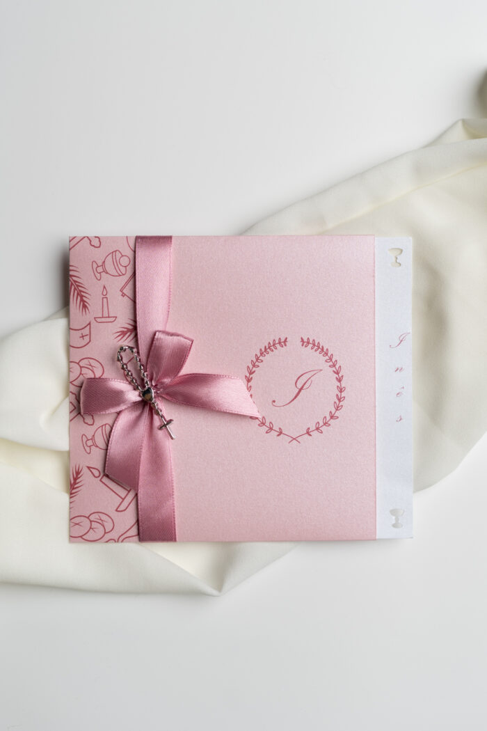 Convite Comunhão Terço Rosa, personalizado e impresso ao seu gosto