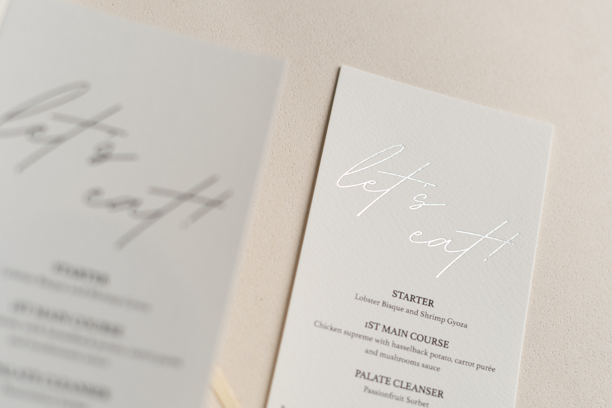 Réalisés avec amour, nos menus de mariage sont conçus pour chaque client, une idée qui découle des détails de leur histoire. Racontez-nous donc les choses telles qu'elles sont, avec vos propres mots.