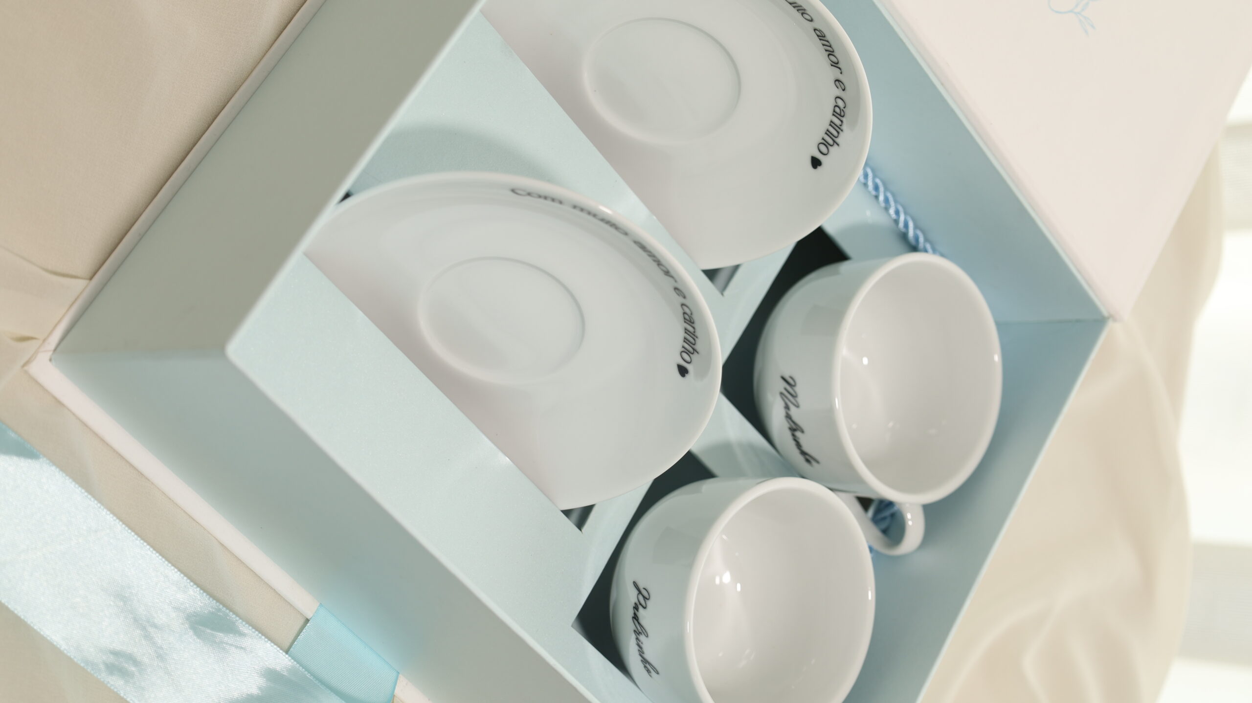 Chávenas de chá personalizadas para padrinhos em caixa de papelão totalmente personalizada.