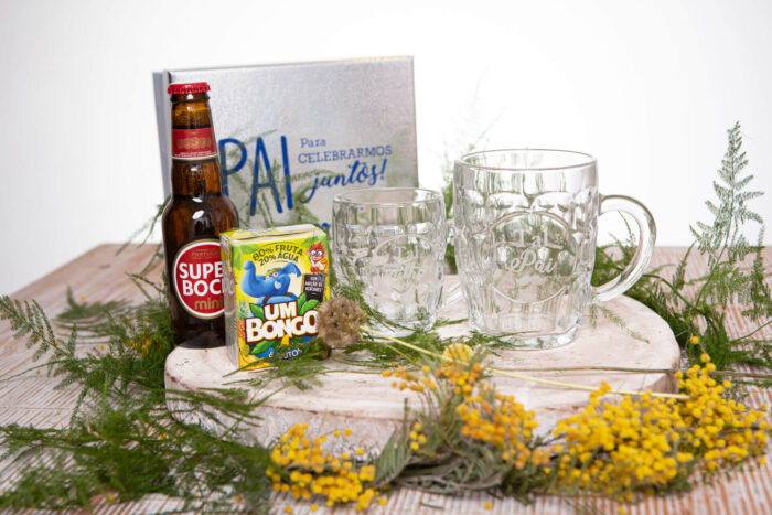 Prenda Pai Caixa Partilhar (caixa com autocolante personalizado na tampa, Mini Super Bock, Bongo e 2 Canecas com gravação).