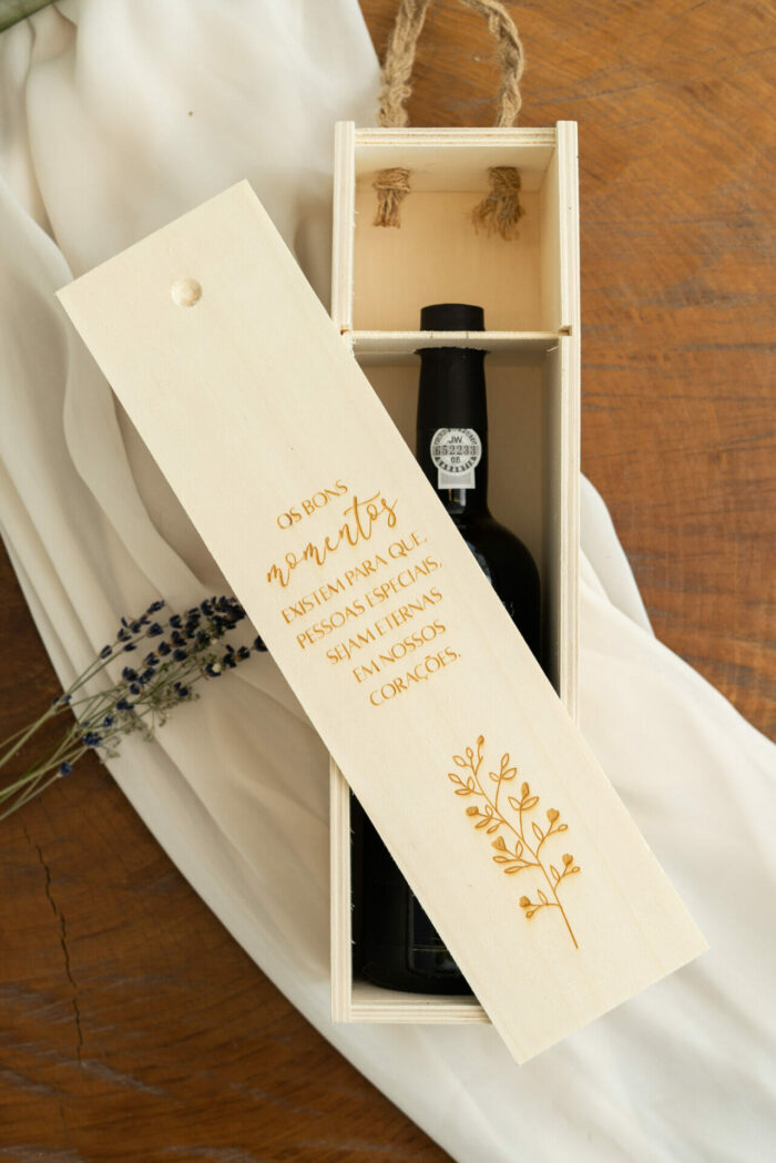 Lembrança Casamento Padrinhos Madeira com Garrafa de Vinho do Porto